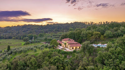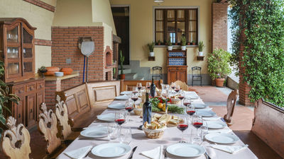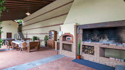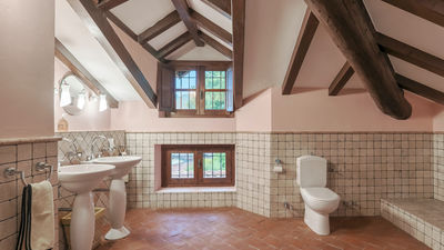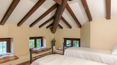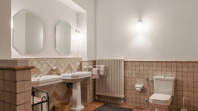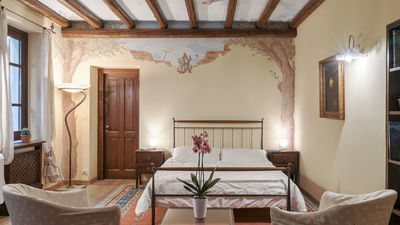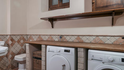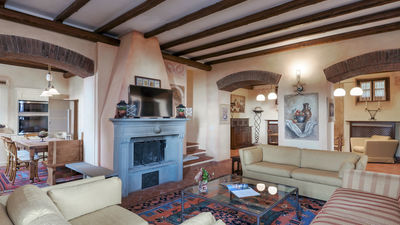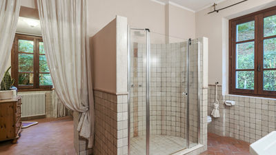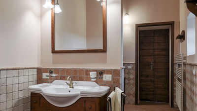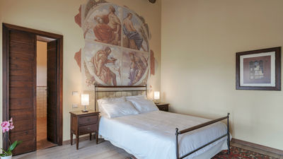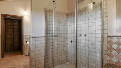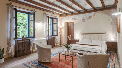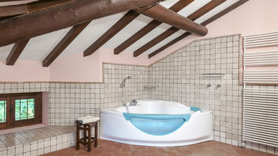 Interior:Tenuta Navelli consists of a single building divided into a main body and an annex (communicating, when necessary, through the double door of a twin bedroom on the first floor). The main body has three floors connected by internal stairs. GROUND FLOOR - The main entrance on the ground floor leads into the spacious living area organised with two dining areas, a living room with sofas and ornamental fireplace, and a large built-in kitchen. The pantry, with its hallway, and the guest bathroom, containing the laundry area, complete the floor. FIRST FLOOR - On the first floor is a study, a large double bedroom with ensuite bathroom with shower (with double entrance), another double bedroom with ensuite bathroom with shower and a wellness area with Finnish infrared sauna. SECOND FLOOR - On the second attic floor is a family suite with a twin bedroom with joinable beds, a reading room, a bedroom (without door) with double bed and a bathroom with tub. ANNEX - GROUND FLOOR - With the entrance adjacent to the main one, it consists of a living room with ornamental fireplace and built-in kitchenette, a double bedroom with access to the outside and an ensuite bathroom with shower. ANNEX FIRST FLOOR: Internal stairs lead up to the first floor, where a landing leads to a hallway communicating with a double bedroom, a twin bedroom with joinable beds and a bathroom with shower. Air conditioning in all bedrooms (three with portable units).