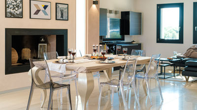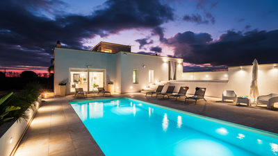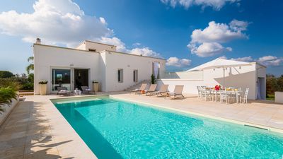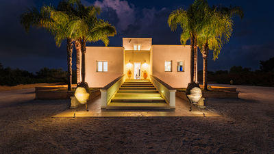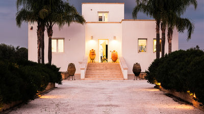 Dimora Solaris is a contemporary villa set among olive groves in the countryside outside Ugento, just a short drive from the white sandy beaches of Torre San Giovanni. Spead over two floors, the modern interiors feature an open-plan living area with a kitchen and dining space, three double bedrooms and three bathrooms. Large windows allow natural light to fill the main living space on the ground floor, with direct access to the pool and terraces. Centuries-old olive trees and Mediterranean essences contribute to an authentic and rejuvenating atmosphere, ideal for moments of peace and well-being. The villa is well positioned for visiting the historic towns and beaches of southern Salento, including Gallipoli and Santa Maria di Leuca.
