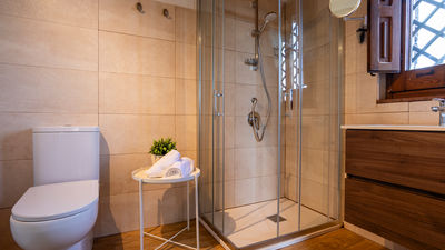 The villa, with a surface area of 150 sqm, is on one floor with two levels, connected by five internal steps. The main entrance is located on the ground floor. GROUND FLOOR - Open-plan area comprising a kitchen with counter, dining table and living area with sofa; laundry room; bathroom with shower. UPPER FLOOR - Sleeping area consisting of two double bedrooms and a twin bedroom; two bathrooms with shower.