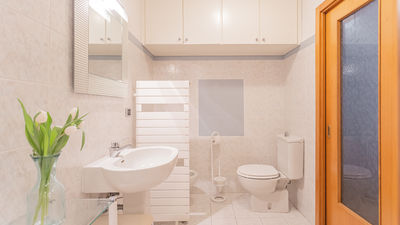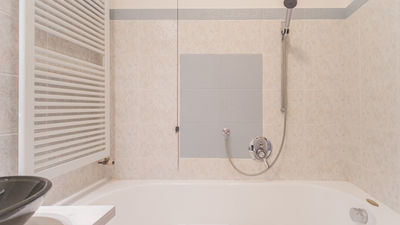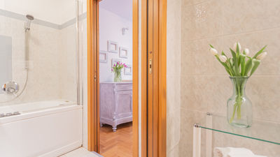 To the left of the entrance, we find the bathroom, equipped with an anteroom where there is a sink. The bathroom is spacious and offers a large bathtub, perfect for indulging in moments of complete relaxation. The light tones and the light that floods the space enhance the feeling of space and cleanliness, creating an atmosphere of freshness and comfort.