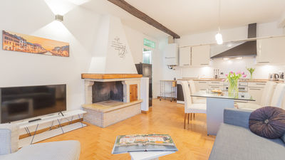 On the left, we find the kitchen, integrated into the living room in a harmonious and well-lit environment. The stove is equipped with all the necessary appliances for comfortable cooking, and the living area extends with a comfortable sofa, a fireplace that adds warmth and character to the space, and a dining table perfect for meals in company. Next to the sofa, an inviting armchair completes the relaxation area, creating an ideal environment for relaxation and comfort.
