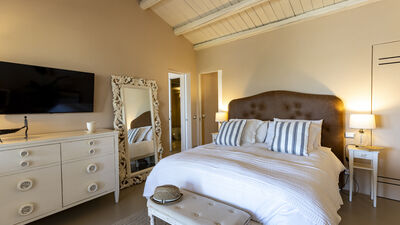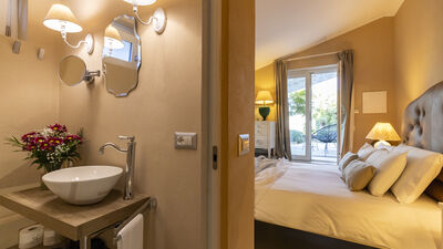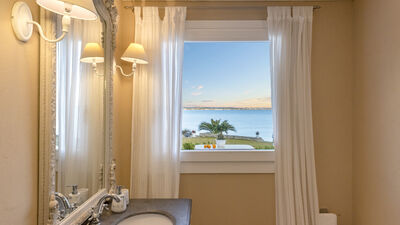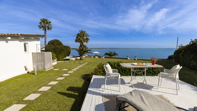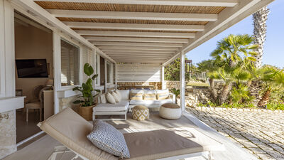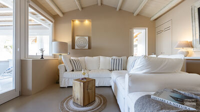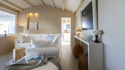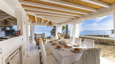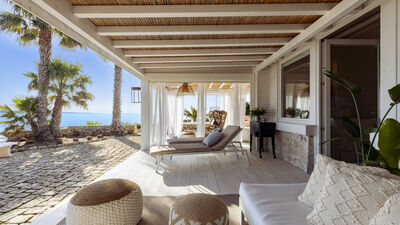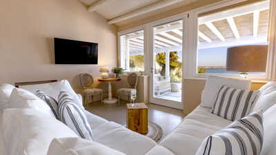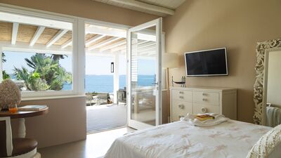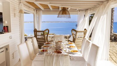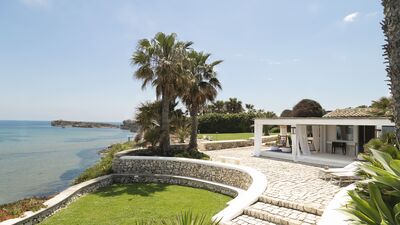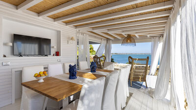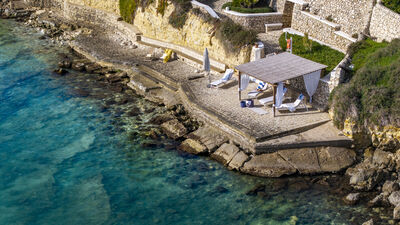 From the automatic gate on the provincial road, there is access to a large terrace with three covered (and as many uncovered) parking spaces. From here start wooden walkways, stone paths and cobblestone terraces that connect the various buildings immersed in a Mediterranean garden of about 4000 square meters, with fragrant shrubs, meadows and flowers. Each cottage has a private bleached wooden terrace for each room, furnished with a shaded relaxation area. The heart of the property is the large terrace overlooking the sea, with outdoor dining area, relaxation areas and panoramic corners. A path leads to the gate that opens onto a stone terrace on the seashore, with a shaded pergola and sun loungers to relax between baths. Outside there are two cold water showers: one on the stone terrace and one on the lawn terrace. Sun loungers are distributed on various terraces. Note: the dry stone walls typical of the area are very low and overlook the cliff, this aspect makes the property not suitable for children under 10 years old. N.B.: Please note that photo shoots are usually carried out in spring, so the colors and blooms of the gardens, lawns and parks may be different when you enter the villa.