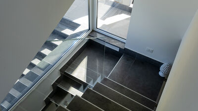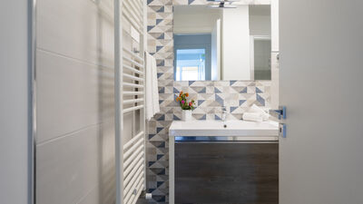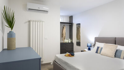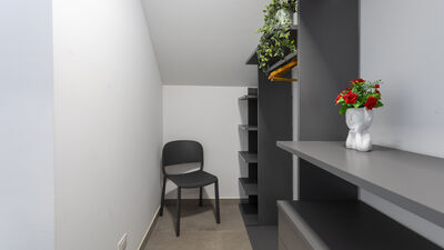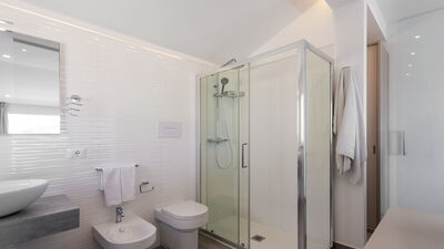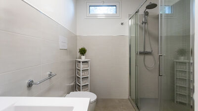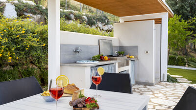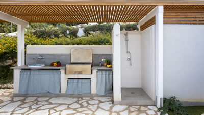 The fenced garden covers about 1000 square meters between paved areas and lawn areas. An iron gate leads to the parking area with two parking spaces, in the immediate vicinity of the main entrance. The porch at the exit of the living room on the ground floor is equipped with a dining table and sitting area. At the back of the house, on an upper level accessible by a short ramp, is the barbecue area with an adjoining shower and toilet. N.B.: Please note that the photo shoots are usually carried out in spring, so the colors and blooms of the gardens, lawns and parks may be different when you enter the villa.