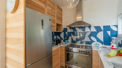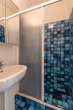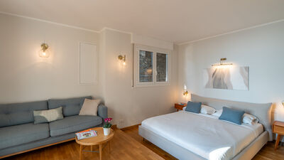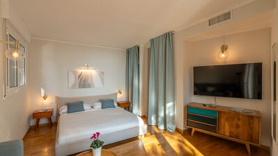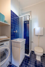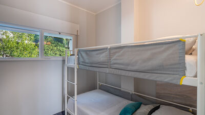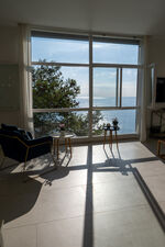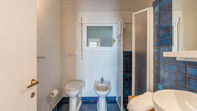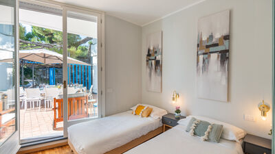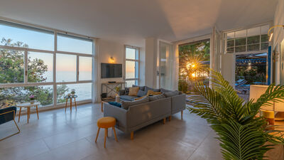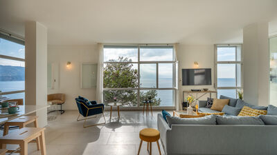 Crossing the large terrace, the entrance door leads into a spacious open-plan area comprising the living room with large windows overlooking the sea, the dining area and the adjoining kitchen. A small hallway leads to the sleeping area, composed of: a twin bedroom with joinable beds; a double bedroom; a bathroom with shower; a bedroom with bunk beds and ensuite bathroom with shower and washing machine; a separate double bedroom (with access from the terrace) with small sitting area, TV and ensuite bathroom with shower. Air conditioning in the bedrooms and in the living room.