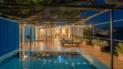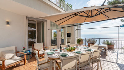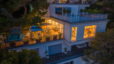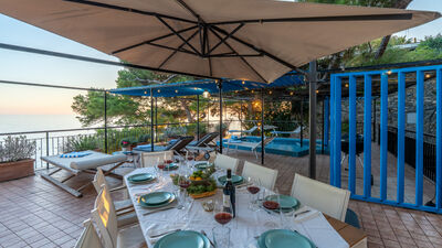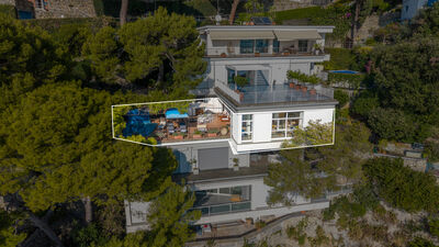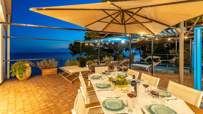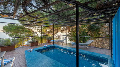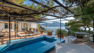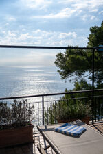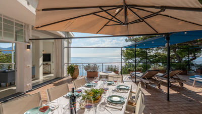 The outdoor area is represented by a large terrace of about 100 sq m overlooking the sea, where a beautiful maritime pine tree provides ample shade. Its small, shallow swimming pool (50 cm) is ideal and safe for children, and the large table will be the favourite meeting place for outdoor lunches and dinners on warm summer evenings, with the possibility of bringing out and using the portable barbecue. Armchairs, sunbeds and small tables complete the terrace furniture, allowing you to fully enjoy the extraordinary panoramic position of the terrace in total comfort.