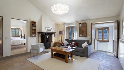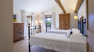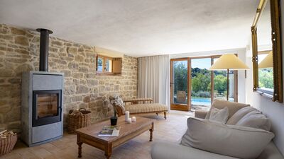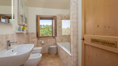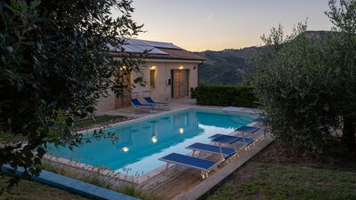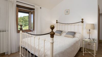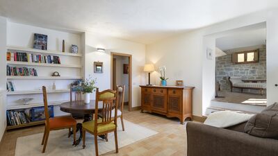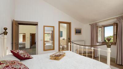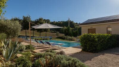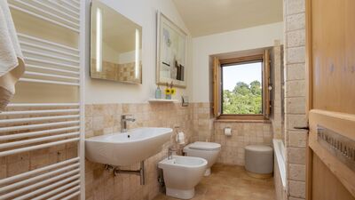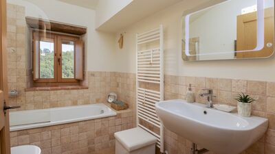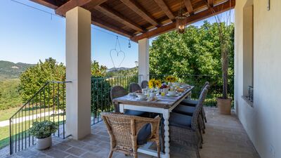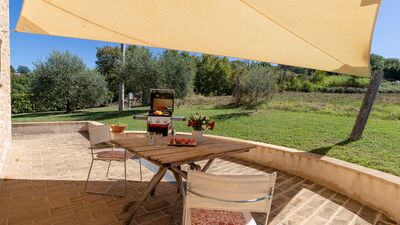 The house is surrounded by about 3000 square meters of garden, located at an altitude of 540 m and bordered by hedges, fruit trees and olive trees. The garden is mostly flat around the house and the pool, which slopes gently down to the ground below. A porch with dining area and lounge offers great views of the surrounding countryside. On the opposite side of the house there is a shaded area with a barbecue. Outdoor parking is available on the property for up to three cars. N.B.: Please note that the photo shoots are usually carried out in spring, so the colors and blooms of the gardens, lawns and parks may be different when you enter the villa.