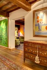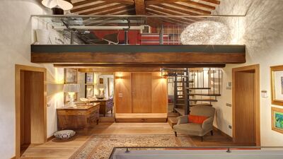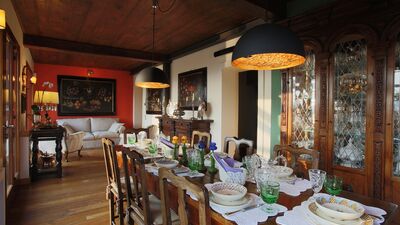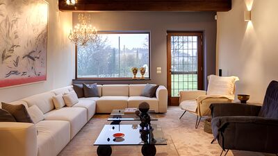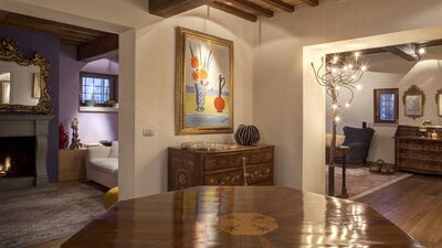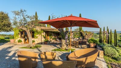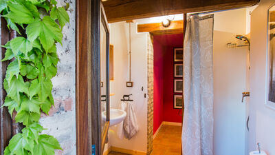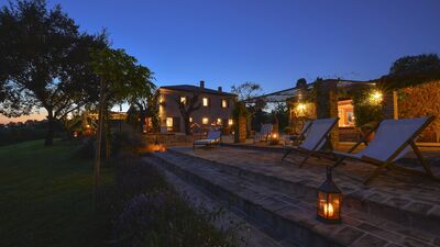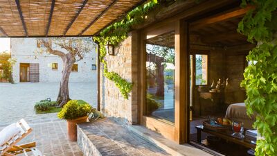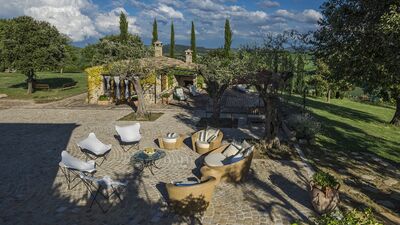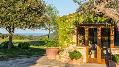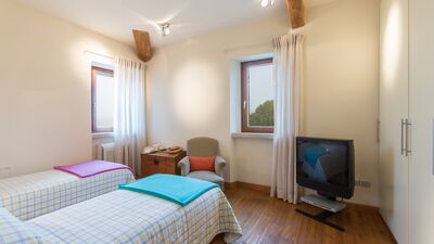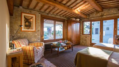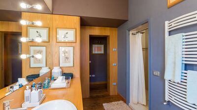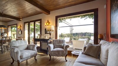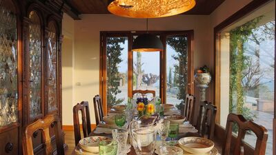 The complex (about 330 square meters) consists of the main villa and an annex about 15 m away. The villa is spread over two levels connected by internal stairs. GROUND FLOOR - Large living room with wooden ceilings, living room, dining room, TV area with fireplace, reading corner; kitchen; service bathroom. FIRST FLOOR: includes a mezzanine that leads to two double bedrooms and a twin with joinable beds, all with private bathrooms, two with shower and one with bathtub; panoramic terrace. ANNEX: Living room, a double bedroom with joinable beds and a bathroom with shower. Air conditioning in the bedrooms.