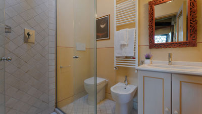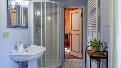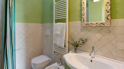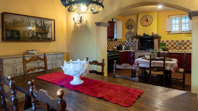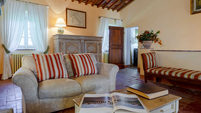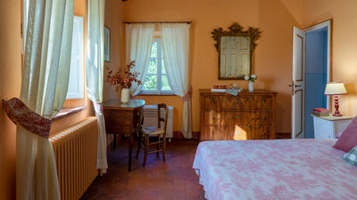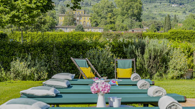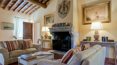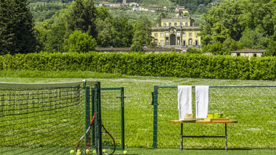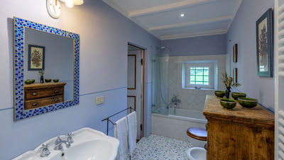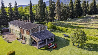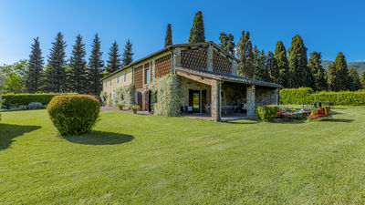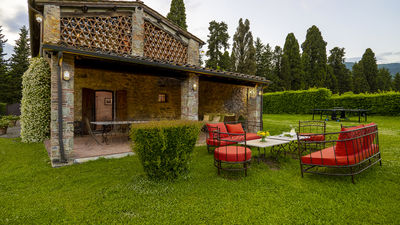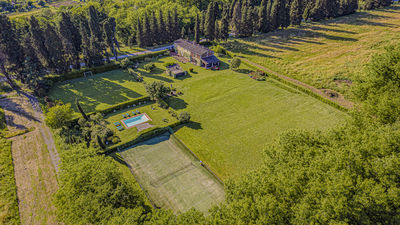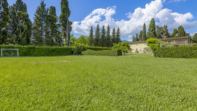 The house is surrounded by flat land with lawn, vegetation and typical Tuscan trees, including cypresses and laurels. The outdoor dining and relaxation area is located under a porch just outside the living room French doors. In the garden there is a tennis court, an area for soccer and various areas with seating for relaxation, in addition to the barbecue area and wood oven. N.B.: Please note that the photo shoots are usually carried out in spring, so the colors and blooms of the gardens, lawns and parks may be different when you enter the villa.