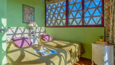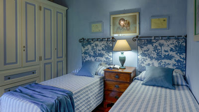 The house is spread over two floors connected by two internal stairs. GROUND FLOOR โ Entrance to the dining room; tea room; main living room with ornamental fireplace and access to the outdoor porch; kitchen; service bathroom with washing machine. FIRST FLOOR โ Lounge area with sofas and ornamental fireplace; three double bedrooms with en suite bathroom with shower; a double bedroom and a twin bedroom that share a bathroom with bathtub; a twin bedroom with adjoining bathroom with shower. Air conditioning in the rooms.