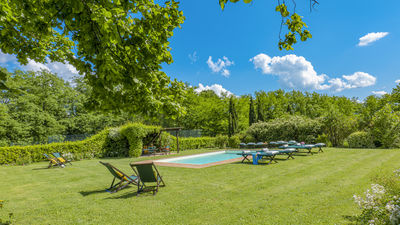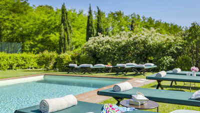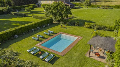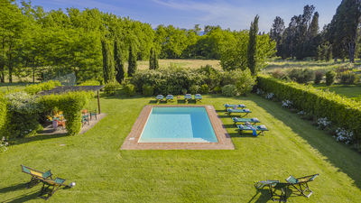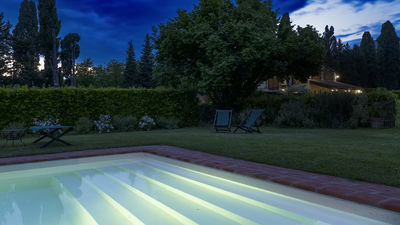 The pool is located a short distance from the house and has an open view of the surrounding countryside. Rectangular with measures 5 x 8 m and a depth of 1.40 m; covered in sand-colored PVC with terracotta edging; salt purification; Roman stairways for the entrance. The surrounding lawn is equipped with sun loungers and a pergola. The interior lighting allows it to be used even after dark. The pool is open from the last Saturday in April to the first Saturday in October.